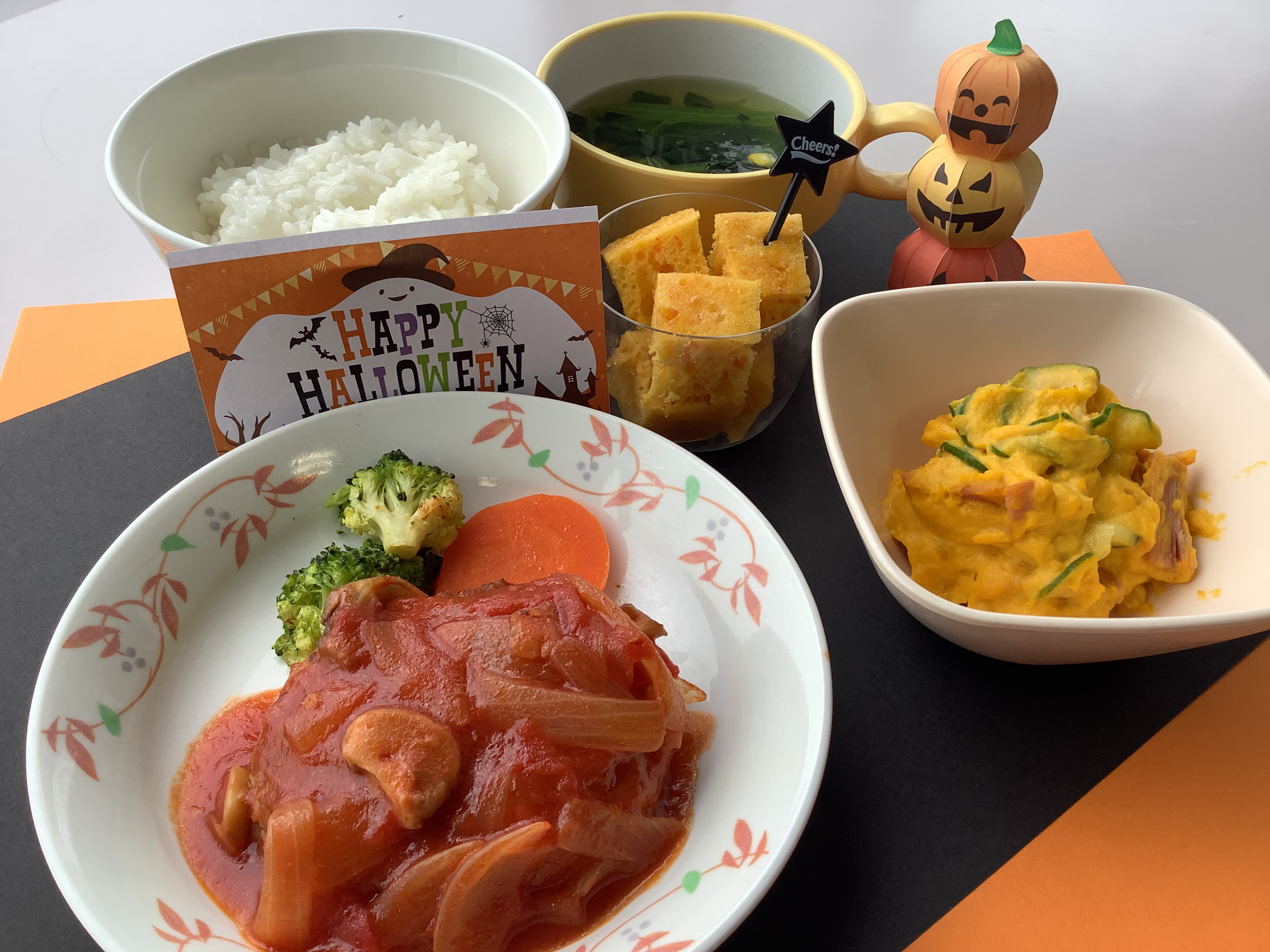 お知らせ BACK 【イベント食】ハローウィンメニュー 2025年10月31日 急に寒くなりましたが、いかがお過ごしでしょうか。 本日はハローウィンメニューを提供しました。 ケーキに挑戦です! <メニュー> ・ごはん ・煮込みハンバーグ ・南瓜サラダ ・コンソメスープ ・キャロットケーキ ケーキは一口大に切って食べやすくピックを刺してみました。 これからどんどん寒くなりますので、体調管理はしっかりとしましょう。 Happy Halloween! 栄養科 一同 ← ひとつ前のページへ戻る