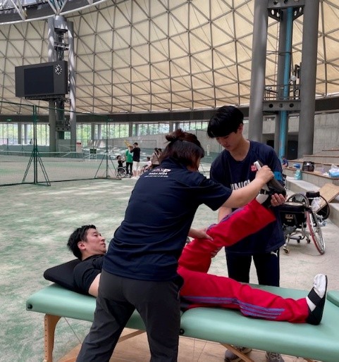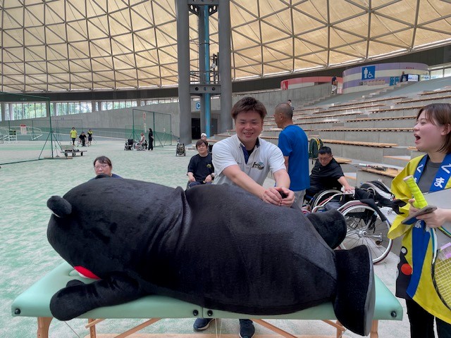 部門紹介 リハビリテーション科 火の国杯車いすテニス熊本大会 2025年9月26日 2025年7月5~6日 パークドーム熊本にて火の国杯車いすテニス熊本大会が開催され、全国から車いすテニス選手が集結しました。私たちは、フィジオとして選手の熱中症対応、応急処置やテーピング、コンディショニングを担当しました。また、5日に『くまモン』が来場し、くまモンが処置を受ける?なんてことに。選手だけでなく、フィジオも激励してくれました。 理学療法士 川中洋平 大津知昌 ← ひとつ前のページへ戻る